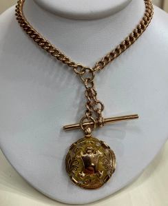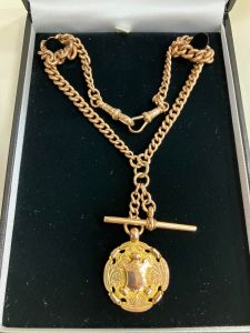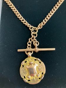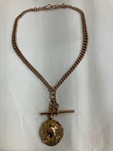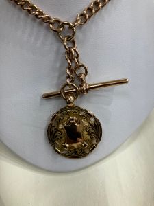 This yellow gold double Albert chain is graduated and is as a mark of its high quality is stamped on every link. It fastens with two swivel fasteners which are very in-keeping with the original style of the necklace. Attached to the chain is a traditional t-bar that would have been attached to the Albert chain when it was worn on a waistcoat. The medal is hallmarked Birmingham 1907. It has a vacant cartouche on the shield front to it which can be engraved. The Albert chain measures 406mm (16”) The medal hangs 60mm from the Albert chain and the t-bar hangs 30mm from the chain. The pendants and the chain weighs 47.6g in total.