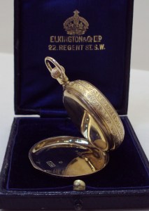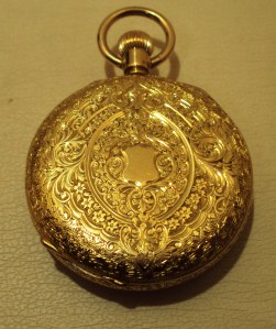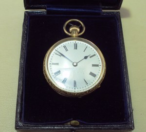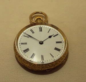 This is a fine example of an 18ct gold ladies pocket watch. It is an open faced pocket watch dating from the 19th century. The white enamel dial with black Roman numerals looks clear and clean and very easy to read. The enamel covering to the dial itself is in excellent condition. The watch face is completed by midnight blue coloured hands. The watch has a top button wind for the Swiss mechanical movement. The watch has a negative setting located at the 1 o’clock position on the watch case. To give some idea of scale, the watch measures approximately 34mm x 34mm. The case is engraved with a fancy engraving to the back and sides with a decorative foliate design, that is really striking. The pocket watch is in excellent condition with no personalised engraving. The watch has been serviced and is sold with a 1-year guarantee from ourselves.