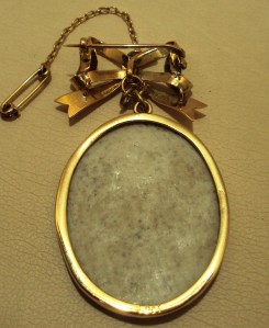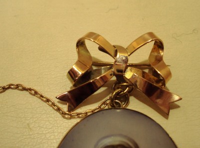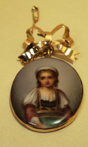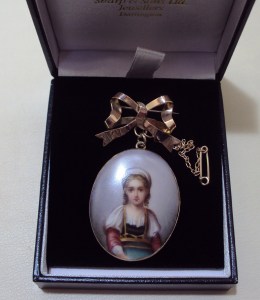 With a delicate hand painted picture this porcelain brooch set in 9ct yellow gold with a 9ct yellow gold bow fastener has a highly unusual ornate design. In the days before photography a hand painted portrait miniature was the only way to preserve an image of a loved one. In Victorian times portrait jewellery was a sentimental favourite as well as a fashion accessory. The colours of the portrait are still vibrant and the piece is in excellent condition. The oval brooch measures approximately 33mm x 39mm. The bow pin fastener is 33mm at its widest point by 14mm and has a safety pin style safety chain for secure fastening. The full drop of the brooch from the top of the bow fastener to the bottom of the portrait is 60mm.