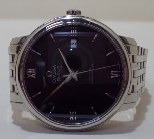 This Omega De Ville Prestige Co-Axial features a sun-brushed black dial with polished silver Roman numerals and indexes, and a date indicator display at the 3 o’clock position. This is the 424.10.40.20.01.001 model with box and papers dated 2017.