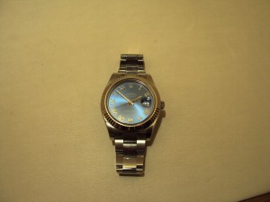 Introduced in 1945 the Oyster Perpetual Datejust was the first wristwatch to feature a date display, clearly visible with a special magnifying Cyclops lens. It has since become a classic design and is still manufactured today. In 2009, the Datejust II was launched featuring all the excellent design features of the Datejust in a more majestic format with enhanced innovation features. An official chronometer rating is given to this self winding, perpetual movement housed in the 41mm case with 48 hour power reserve. A sapphire crystal protects the blue dial with silver Roman numeral. The watch is waterproof to 100m (330 feet) and has a screw-down double Twinlock system to keep the watch waterproof. The Oyster bracelet is made from 904L grade Stainless steel with an 18ct white gold diamond cut fluted bezel. Rolex use 904L steel as it is a super alloy, it is extremely tough and highly polishable, normally reserved for the chemical industry where maximum resistance against corrosion is essential. The bracelet features a fold over Oyster clasp and has an Easylink comfort extension link for secure fastening and a comfortable fit. This watch is a classic design with an updated twist, still retaining a timeless feel and would look good on any wrist.