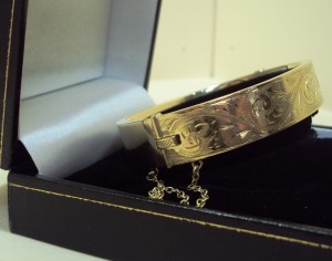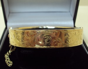 This 9ct yellow gold engraved bangle is of classic design. The bangle is half engraved with a leaf style pattern and the bangle very good condition with only very minor signs of wear. It is hallmarked Birmingham 1975. The bangle is hinged and has a concealed tongue clasp as well as a safety chain. The diameter of the bangle is approximately 65mm x 58mm and is 4mm thick. It is oval in shape and very smooth on the inside making it comfortable to wear. It is a striking piece of jewellery in very good condition.