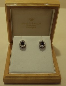 These striking sapphire and diamond cluster earrings are set with a stem and butterfly fastener. The central blue sapphire is surrounded 12 diamonds, which give the clusters extra sparkle. The stones are set in 9ct white gold and have white gold claws adding further brightness and whiteness to the earrings. The yellow gold stem and butterfly fastener provides a firm and secure, yet comfortable fit. To give an idea of scale each earring measures approximately 11mm x 9mm.