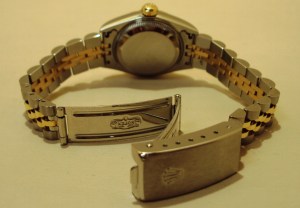 Introduced in 1945 the Oyster Perpetual Datejust was the first wristwatch to feature a date display, clearly visible with a special magnifying Cyclops lens. The official chronometer rating is given to this self winding movement housed in the 26mm steel case with 18ct gold fluted bezel. A sapphire glass protects the champagne baton dial, which is a classic design. The watch is waterproof to 100m/330 feet. The Jubilee bracelet with fold over clasp is made from 18ct yellow gold and 904L stainless steel. Rolex use 904L steel as it is a super alloy and which marries perfectly with the 18ct gold. The steel is extremely tough and highly polishable, normally reserved for the chemical industry where maximum resistance against corrosion is essential.