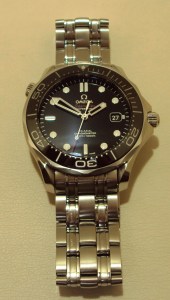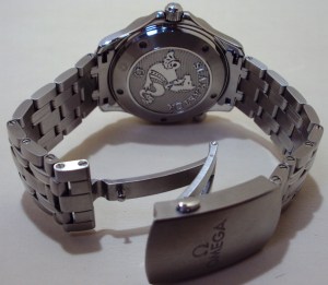 The Seamaster collection to which this watch belongs pays tribute to the maritime heritage of the Omega brand. The watch is waterproof to a depth of 300m (1000 feet), has a helium escape valve for long periods spent underwater and a revolving bezel that can only rotate anti-clockwise for reliable checking of dive and decompression times. The watch has a screw-in crown that screws directly into the case, providing reliable water resistance that a divers watch needs. The watch has a domed scratch-resistant crystal with an anti-reflective treatment on both sides, a highly durable cover over the dial. The solid link bracelet has a push button release fold over clasp which has a divers extension to the bracelet, useful when wearing over a wetsuit. This watch is classified as a chronometer, a watch whose movement has obtained an official rate certificate from the COSC (Official Swiss Chronometer Testing Institute) after having passed precision tests in different positions and at different temperatures. These tests are conducted over a 15-day period.