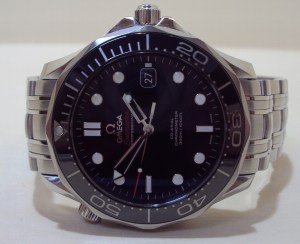 This Omega Seamaster Professional Co-Axial features an black ceramic unidirectional rotating bezel, black dial with luminous dots and batons and a date indicator display at the 3 o’clock position. This is the 212.30.41.20.01.003 model with box and papers dated 2016.