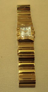 The 20mm 18ct gold case houses an Omega 1376 quartz precision movement with rhodium plated finish. It is in full working order. The white mother of pearl diamond dot dial with twelve diamonds, one at each hour marker, is surrounded by a diamond bezel with a square finish.