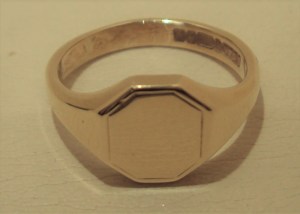 This 9ct yellow gold solid polished signet ring has a octagonal design with double edging around the cushion shaped head. The head of the ring measures approximately 11mm x 10mm and the ring weighs 4.6g. The ring is desirable as it is free from personalised engraving. It would however be possible to engrave initials onto the head. UK size N, this ring can easily be resized in the workshop on our premises.