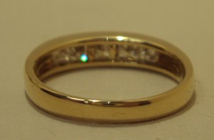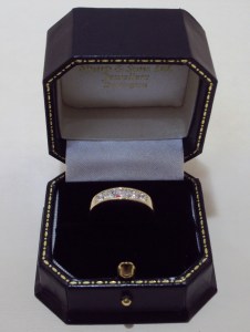 This is an eye-catching half eternity ring. The five princess cut diamonds are channel set, the setting is very smooth and comfortable to wear. The five stones are graduated and the total diamond weight is 0.80ct over the five stones. The rich colour of the gold and the stones compliment each other well. The shank is substantial and the ring has a rubbed edge feel to it. UK size 0, this ring can be resized in the workshop on our premises.