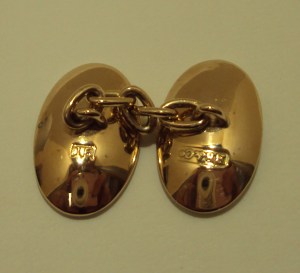 These Art Deco 15ct yellow and white gold cufflinks are a simple, yet striking piece of jewellery. Each of the oval cufflinks are inlayed with mother of pearl, a rich, iridescent colour and a single Victorian rose cut diamond in a rubbed edge setting, set centrally. The cufflinks have a white gold outer rim. The back of the cufflinks are 15ct yellow gold and have a chain link between the panels. To give an idea of scale, each cufflink measures approximately 18mm x 11mm. The cufflinks are displayed in their original box with F.G. Towill of Exeter printed on the inside of the box lid.