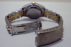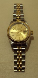 Introduced in 1945 the Oyster Perpetual Datejust was the first wristwatch to feature a date display, clearly visible with a special magnifying Cyclops lens. The official chronometer rating is given to this self winding movement housed in the 26mm steel case with 18ct gold fluted bezel. A sapphire crystal protects the champagne baton dial, which is a classic design. The watch is waterproof to 100m/330 feet. The Jubilee bracelet with fold over clasp is made from 18ct yellow gold and 904L stainless steel. Rolex use 904L steel as it is a super alloy and which marries perfectly with the 18ct gold. The steel is extremely tough and highly polishable, normally reserved for the chemical industry where maximum resistance against corrosion is essential.