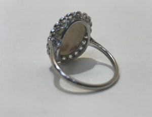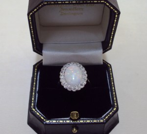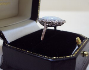 The is a striking ring – a Victorian era Opal and Diamond cluster. The opal to the centre has beautiful colours and lustre. It is set in a platinum ornate basket weave undersetting with a platinum shank. The centre opal is surrounded by 20 Victorian rose cut diamonds set in a smooth rubbed edge setting and each stone has an attractive milgrain edge to it. To give some idea of scale the head of the ring measures 19mm x 10.5mm and the lovely flat setting would make it easy to wear. UK size N, this ring can easily be resized in the workshop on our premises.