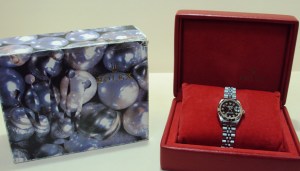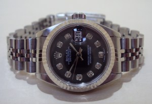 This Rolex Ladies Datejust Oyster Perpetual Stainless Steel features a fluted stainless steel bezel with a black diamond dot dial, a stainless steel Jubilee bracelet and a date indicator display at the 3 o’clock position. This is the 79174 model with box dated 2005.