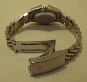 Introduced in 1945 the Oyster Perpetual Datejust was the first wristwatch to feature a date display, clearly visible with a special magnifying Cyclops lens. The official chronometer rating is given to this self winding movement housed in the 26mm steel case with 18ct gold fluted bezel. A sapphire glass protects the champagne baton dial, which is a classic design. The watch is waterproof to 100m/330 feet. The Jubilee bracelet with fold over clasp is made from 18ct yellow gold and 904L stainless steel. Rolex use 904L steel as it is a super alloy and which marries perfectly with the 18ct gold. The steel is extremely tough and highly polishable, normally reserved for the chemical industry where maximum resistance against corrosion is essential.