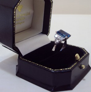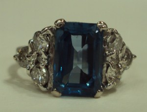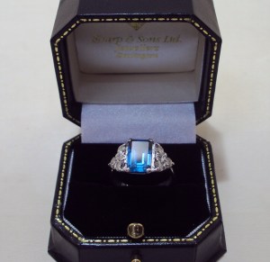 This is an unusual and incredibly eye catching ring. The 18ct white gold shank and head holds a ‘London’ blue topaz, emerald cut stone. The ‘London’ blue topaz is characterised by a darker, inky blue colour compared to the lighter tone found in a ‘Swiss’ blue topaz. It is thought to be called ‘London’ blue, due to the prestige the city has tied to topaz and also the largest blue topaz weighing 9381 carats is displayed in the city’s Natural History Museum. The topaz has dimensions of 10.38mm x 6.86mm. The central stone is flanked by a trefoil of diamonds on each side. The diamond content is approximately 0.60 carats. The ring is hallmarked Birmingham 1973. The undersetting to the ring is a fancy, attractive design and the shank is engraved. To give some idea of scale the head of the ring measures 18.5mm x 11mm. UK size O, this ring can be resized in the workshop on our premises.