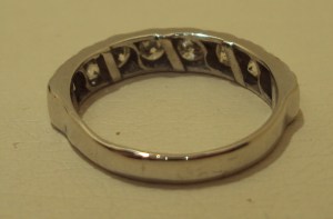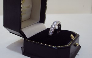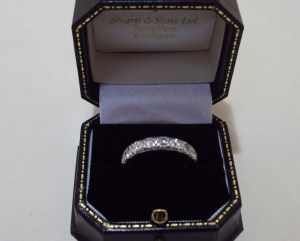 This is an eye-catching half eternity ring. The eight diamonds are set in a smooth claw setting and the ring is comfortable to wear. The eight stones are equal in size and the total diamond weight is 0.80ct over the eight stones. The bright white colour of the gold and the stones compliment each other well. The shank is substantial and the ring has a rubbed edge smooth feel to it. UK size Q 1/2, this ring can be resized in the workshop on our premises.