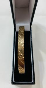 This 9ct yellow gold engraved bangle is of classic design. The bangle is engraved all the way around its circumference, with a leaf style pattern set on a diagonal, with a polished and satin finish. The bangle is in excellent condition with no signs of any dents. The bangle will slip over your wrist and is meant to hang loose. The diameter of the bangle is approximately 67mm x 67mm and is 0.7mm thick. It weighs approximately 12g. It is round in shape and very smooth on the inside making it comfortable to wear.