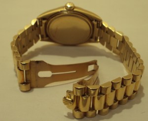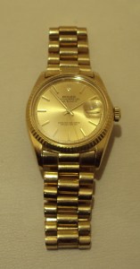 Introduced in 1945 the Oyster Perpetual Datejust was the first wristwatch to feature a date display, clearly visible with a special magnifying Cyclops lens. It has since become a classic design, that never goes out of fashion. An official chronometer rating is given to this self winding, perpetual movement housed in the 36mm case. A plexi-glass protects the champagne baton dial. It has a 18ct gold president bracelet with fold over concealed clasp.