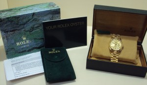 Pre-Owned Rolex Datejust 18ct Gold Oyster Perpetual Wristwatch in Very Good Condition, considering its age, with some minor marks. Model 1601/8 Manufactured 1969/70 Boxed with Service Papers.