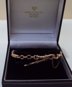 This bar and belcher bracelet is made from sought after 9ct old rose gold. The bracelet dates from the Edwardian era and it has a lovely rich colour. It is made up from five faceted cut belcher links and then a faceted bar link, all the way around and it fastens from each end using two Albert swivel fasteners. It has a rose gold t-bar hanging from one of the swivel fasteners. For extra safety it has a rose gold safety chain fitted. It is approximately 180mm in length and weighs 14.5g. It really is a classic piece which would look good on any wrist.
