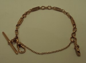 9ct rose gold Edwardian era faceted bar and belcher link bracelet with t-bar and double swivel fastener