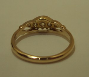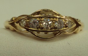 This 18ct yellow gold boat shaped ring contains five old cut diamonds set in a fancy boat style setting. The rich colour of the 18ct yellow gold really sets off the stones. The five diamonds are set in a line and the setting around them has a circular halo style design with fancy scroll shoulders. To give some idea of scale the head is approximately 11mm x 6 mm. UK size M this ring can easily be resized in the workshop on our premises.