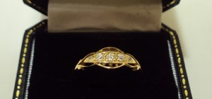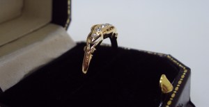 18ct yellow gold boat shaped ring set with five diamonds in a fancy halo style setting