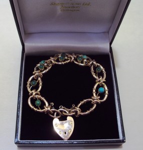 This rose gold fancy bracelet is made from sought after 9ct old rose gold. The bracelet dates from the Victorian era with a hallmark from Chester 1901. It has a lovely rich colour and has a intricate stone set design which is really unusual. It is in excellent condition considering its age. It is made up from eight oval links, each set with turquoise and a vine style filigree work to the links, and some links are set with seed pearls. The bracelet fastens with a rose gold heart shaped padlock and for extra safety it has a rose gold safety chain fitted. It is approximately 191mm in length (7.5 inches)