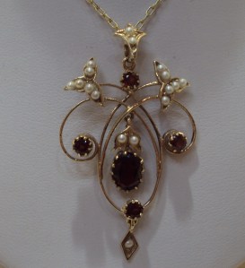 This is a stunning pre owned Edwardian era pendant. The 9ct yellow gold is set with an five garnets in a fancy flower design. The flower design is further enhanced by the pendant being set with seed pearls. The pendant has a central movable drop set with a large garnet and seed pearls. The leaf bale is set with two seed pearls. The detail and workmanship of the pendant is beautiful and it lies flat on your neck, making it easy to wear as well. The yellow gold chain is solid and approximately 18″ (460mm) in length. The finished pendant and chain length is approximately 20” (508mm) To give an idea of scale, the pendant measures approximately 25mm (at its widest point) x 43mm (drop).