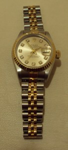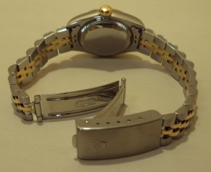 This Rolex Ladies Datejust Oyster Perpetual Bi-Metal features a fluted 18ct gold bezel with a beautiful silver dial, diamond dot indicators, an 18ct gold and stainless steel Jubilee bracelet and a date indicator display at the 3 o’clock position. This is the 79173 model with box and papers dated 2004.