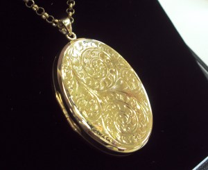 9ct yellow gold oval handmade British locket with a hand engraved flower pattern and a 9ct gold solid belcher link 485mm (19”) chain