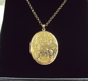 This pre-owned locket is a lovely piece of fine jewellery. It was handmade in Britain by Payton Pepper and Sons Ltd, who were said to be British manufacturers of the ‘best lockets in the world’. The 9ct yellow gold locket is hinged to open for the display of two photographs. The front side of the locket is hand engraved with a fancy floral motif. The back of the locket is plain polished yellow gold. To give an idea of scale, the locket measures approximately 29mm x 36mm. The locket is on a heavyweight solid 9ct yellow gold belcher chain which is 485mm (19”) in length.