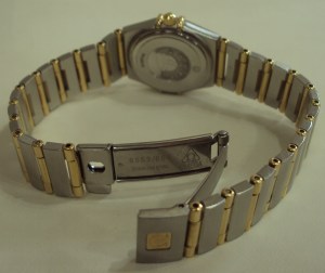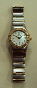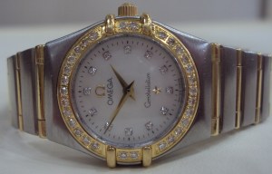 This Ladies Omega Constellation quartz features a white, iridescent mother of pearl dial which is covered by a domed scratch-resistant sapphire crystal with anti-reflective treatment. The mother of pearl dial has gold baton markers and the hours are marked by twelve diamonds to the dial. The watch also has a striking diamond bezel. The movement is mounted on a 22.5mm stainless steel and 18ct yellow gold case body, and is presented on a stainless steel and 18ct yellow gold bracelet. The bracelet has a concealed clasp with push button release. This adds to the smooth, seamless finish of the bracelet. It has 3 bar (30M) water resistance. This model is in excellent condition and is of classic design.
