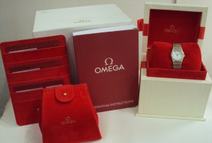 The watch comes with an Omega box and Omega outer, Omega suedette watch pouch, Omega instruction booklet, Omega credit card papers in a red suedette wallet and has a 1-year warranty from ourselves.