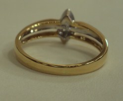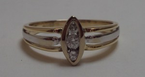 This is an unusual and incredibly eye catching ring. The substantial shank and setting are made from 18ct white and yellow gold. The shank is divided into sections at the head with a wider central band of 18ct white gold, flanked to either side with two bands of 18ct yellow gold. The ring is set with three round brilliant diamonds with an approximate diamond weight of 0.25 carats. The three stones are set in a secure and smooth rubbed edge setting also in 18ct white gold. The setting is marquise in shape and this enhances the modern look and feel to the ring. UK size U1/2, this ring can easily be resized in the workshop on our premises.