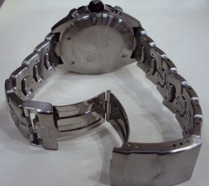 The watch has a black dial and tachymeter fixed bezel with silver baton hour markers. The hands are silver with luminous tips. The three chronograph function dials and the stop watch hand all have yellow accents to provide a perfect sporty contrast to the dial. It has a date window at the 4 o’clock position. It has a matt stainless steel case and concealed clasp two-part bracelet. The bracelet has the look of a tyre tread and the bezel has black rubber accent surrounding it, all adding to the Formula 1 vibe. The TAG Heuer quartz movement is housed in a 43mm case and is water resistant to 200m. The dial is protected by a hard wearing sapphire crystal.