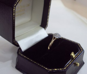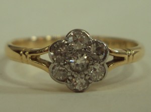 This is an incredibly eye catching, dainty ring. The split shoulder carved ridged band setting is 18ct yellow gold. It has seven diamonds in rubbed edge setting, making it smooth and safe and comfortable to wear. The central stone is surrounded by 6 others, to give the ring its daisy style appearance. UK size O, this ring can be resized in the workshop on our premises.