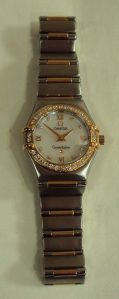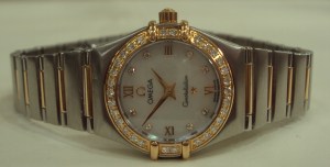 This ladies Omega Constellation quartz features a white, iridescent mother of pearl dial which is covered by a domed scratch-resistant sapphire crystal with multi-layered, anti-reflective treatment. The mother of pearl dial has gold Roman numeral markers at the twelve, three, six and nine o’clock and the hours are also marked by eight diamonds to the dial. The watch also has a striking diamond bezel. The movement is mounted on a 22.5mm stainless steel and 18ct rose gold case body, and is presented on a stainless steel and 18ct rose gold bracelet. The bracelet has a concealed sliding clasp with push button release. This adds to the smooth, seamless finish of the bracelet. It has 3 bar (30m/100ft) water resistance. This model is in excellent condition and has a stunning appearance and design.