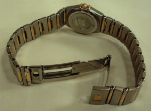 The 22.5mm stainless steel and 18ct rose gold case houses an Omega 1456 quartz precision movement with rhodium plated finish. It is in full working order.