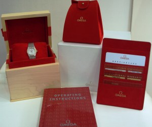The watch comes with an Omega box and Omega outer, Omega suedette watch pouch, Omega instruction booklet, Omega credit card papers in a red suedette wallet from 2005, Omega service credit style from November 2018 as well as the service receipt and has a 1-year warranty from ourselves.