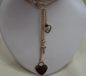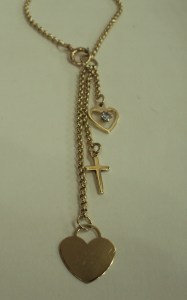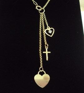 This is eye-catching bespoke necklace and pendants. The 9ct yellow gold belcher chain has a polished finish to each link and hangs 20” (508mm) in length. The finished length of the necklace however is 24”(609mm) as the necklace has three 9ct yellow gold pendants which hang from a oversized jump and bolt ring fastener. The longest pendant is a flat polished heart. The second pendant is a cross and the shortest pendant is a polished stone set open heart. The detail and workmanship of the pendant is lovely and being bespoke, it is not something you will see in other jewellers windows.