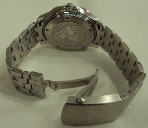 The Seamaster collection to which this watch belongs pays tribute to the maritime heritage of the Omega brand. The watch is waterproof to a depth of 300m (1000 feet), has a helium escape valve for long periods spent underwater and a revolving bezel that can only rotate anti-clockwise for reliable checking of dive and decompression times. The watch has a screw-in crown that screws directly into the case, providing reliable water resistance that a divers watch needs. The watch has a domed scratch-resistant crystal with an anti-reflective treatment on both sides, a highly durable cover over the dial. The solid link bracelet has a push button release fold over clasp which has a divers extension to the bracelet, useful when wearing over a wetsuit. This watch is classified as a chronometer, a watch whose movement has obtained an official rate certificate from the COSC (Official Swiss Chronometer Testing Institute) after having passed precision tests in different positions and at different temperatures. These tests are conducted over a 15-day period.