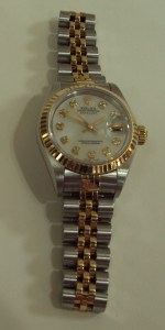 Introduced in 1945 the Oyster Perpetual Datejust was the first wristwatch to feature a date display, clearly visible with a special magnifying Cyclops lens. The official chronometer rating is given to this self winding movement housed in the 26mm steel case with 18ct gold fluted bezel. A sapphire glass protects the white mother of pearl diamond dot dial, which is a classic design. The watch is waterproof to 100m/330 feet. The Jubilee bracelet with fold over clasp is made from 18ct yellow gold and 904L stainless steel. Rolex use 904L steel as it is a super alloy and which marries perfectly with the 18ct gold. The steel is extremely tough and highly polishable, normally reserved for the chemical industry where maximum resistance against corrosion is essential.