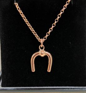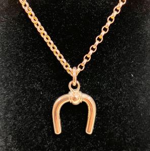 This horse shoe charm pendant and chain is a really unique pre-owned piece of jewellery. The rich colour of the rose gold is really eye-catching To give an idea of scale, the pendant measures approximately 16mm across at its widest point. The horseshoe charm drops down approximately 20mm from the chain, including the rose gold top ring. The horseshoe is on a solid link rose gold belcher chain with a bolt ring fastener which is 457mm (18”) in length.