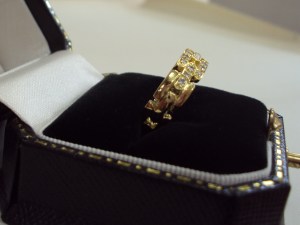 This is an unusual and incredibly eye catching ring. The solid band is made from 18ct yellow gold. It has an attractive triple row ridged shank at the back of the ring. The brick design front of the ring is set with thirty diamonds, set in ten interlocking brick style rows. The other brick rows are plain, highly polished 18ct yellow gold. The diamond content is approximately 0.27 carats. The inside of the ring has a smooth highly polished finish to it which is comfortable to wear. To give some idea of scale the head of the ring is approximately 20mm with a width of 6mm. UK size O, this ring can be resized in the workshop on our premises.
