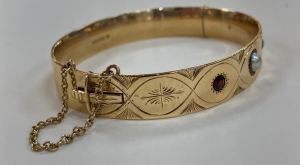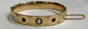 9ct solid wire yellow gold half engraved hinged oval bangle set with two seed pearls and a garnet with a safety chain- Hallmarked Birmingham 1987