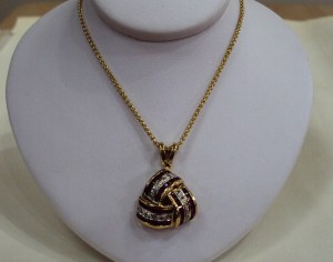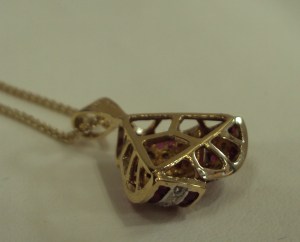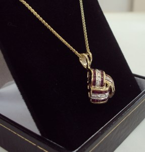 This is a eye catching yet easy to wear pendant. The 9ct yellow gold pendant is set with 42 baguette cut rubies, with a lovely pink/red colour and contrasting with 18 round brilliant cut white diamonds. The stones are set in a channel three row design, as a trefoil knot. The detail and workmanship of the pendant with its basket style undersetting is beautiful and it lies flat on your neck, making it easy to wear as well. The pendant hangs from the chain with a yellow gold chevron that splits at the front into a two rabbit ear design. The 9ct yellow gold spiga chain is solid and approximately 18″ (457mm) in length. To give an idea of scale, the pendant measures approximately 16mm (at its widest point) x 22mm (drop).