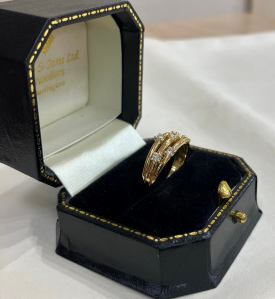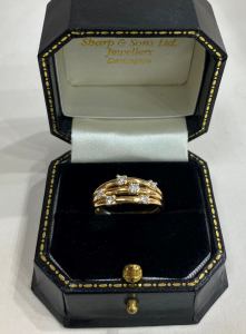 This is an unusual and incredibly eye catching ring. The substantial shank and setting are made from 18ct yellow gold. The shank is divided into three sections across the head. The ring is set with six round brilliant diamonds, two set on each of the band rows with an approximate diamond weight of 0.25 carats. To give some idea of scale the head of the ring measures 7mm x 20mm. The ‘rain dance’ setting is an abstract stacking design and gives a modern appearance to this pretty dress ring. UK size O, this ring can easily be resized in the workshop on our premises.