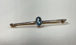 This brooch has such a simple design but is a beautiful piece because of this design. The head of the brooch is fronted in platinum with the back of the brooch and the pin being made from 15ct yellow gold. The centre of the brooch is set with a large single stone Aquamarine. The stone has a lovely rich light blue colour and the head of the stone has many facets, making the stone sparkle. The stone is set in a rubbed edge setting with a milgrain edge. This is a safe and smooth setting. The brooch is approximately 52mm in length and the oval Aquamarine is approximately 6mm x 8.5mm The brooch fastens with a gold pin that has a fold over safety design.