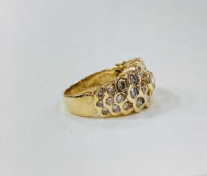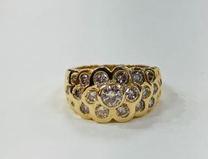 14ct yellow gold flower design ring with approximately 1.50ct of round brilliant cut diamonds spread over 31 stones in a rubbed edge setting